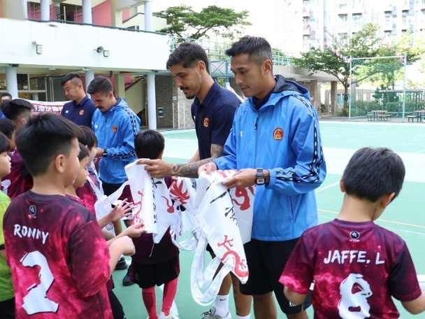 是日下午「龙城军」一行6人踩入校园,守门员教练唐咖名、门将袁皓俊、后卫曾锦涛、巴西前锋卡朗及雷仙奴于有盖操场简单自我介绍后,就进行学生问答环节,由球员解答众学生对足球的疑问。紧接着40名小学生分成4组,在球员的指导下练习左右脚传控及射门的基本功。为实践所学,第二部分安排了30分钟的5对15的友谊赛,射手卡朗更大展「森巴足球」本色,以「的波」、头槌及挑起皮球等花式回传,雷仙奴更使出「茅招」紧抱皮球推进,学生一涌而上合力制服两位巴西前锋,惹人笑逐颜开。