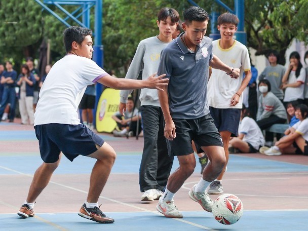 是日下午于学校露天球场,理文4位球员化身教练,分别为全级中四学生提供足球基本训练,超过80名学生分成4组热身,练习传球、控球、射门、弹跳及协调。第二部分理文则安排5对5的友赛,与校队成员切磋,踢至一半,学生队更额外加入15位学生进行对决,学生尾段更施展人墙战术,排成一列守于龙门前,场面搞笑又热闹。负责指导射门的翁煦涛,期望透过足球为学生带来欢乐,「翁仔」又鼓励有意向职业足球方向发展的年轻一代,建立自律的运动习惯:「我觉得青少年阶段最重要嘅系培养兴趣,如果真正热爱踢波,先可以不断进步,好似今日气氛热闹,大家自然更投入。无论系想成为职业球员,未来代表港队,定系外流发展,为香港足球争光,就要为目标努力奋斗,练习多啲,任何运动都系需要日积月累,越早接触踢波,自然有一定水平基础,对香港足球发展绝对系好事。」