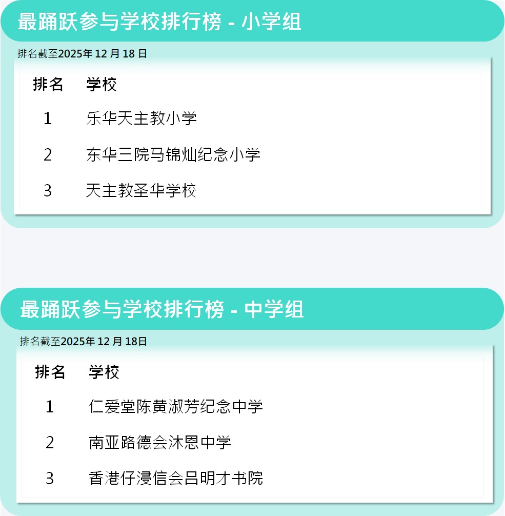 于每阶段比赛中,亦设有「最踊跃参与学校奖」﹙分中小学两组,每组设冠、亚、季军各1名﹚,得奖学校将获赠 奖状 乙张。