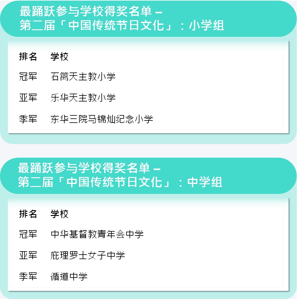 比赛亦设有「最踊跃参与学校奖」﹙分中小学两组,每组设冠、亚、季军各1名﹚,得奖学校将获 奖状 乙张。