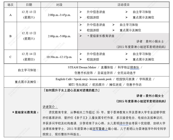 为让学生及家长了解本校升中详情并顺利衔接中学学习,本校特备升中信息活动,诚邀大家参加,详情如下: