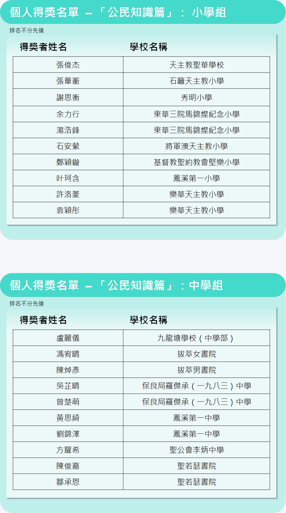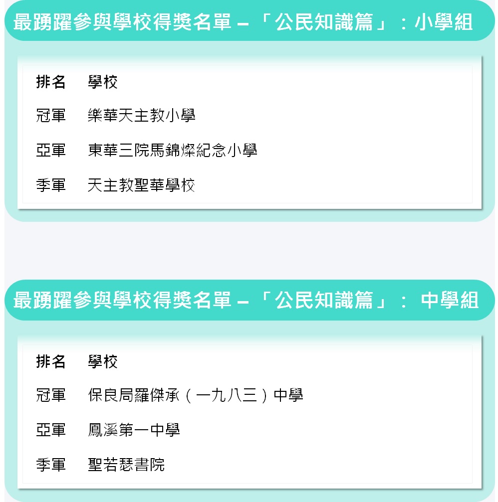 小學組及中學組的學生完成參加所有階段比賽 ﹙共3階段﹚的問題,每組學校參與的學生人數最高的首 3間學校,可獲「公民教育及國民教育」問答比賽 全場總冠、亞、季軍各1名,各組冠軍學校將獲得港幣500元禮券*乙張、亞軍學校將獲得港幣400元禮券*乙張 、季軍學校將獲得港幣300元禮券*乙張;各得獎學校將獲獎狀 乙張。 |