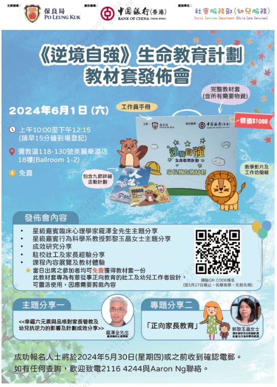 《逆境自強》生命教育計劃是由保良局主辦及中國銀行(香港)有限公司撥款支持,將於2024年6月1日 (星期六)假美麗華酒店舉行教材套發佈會。